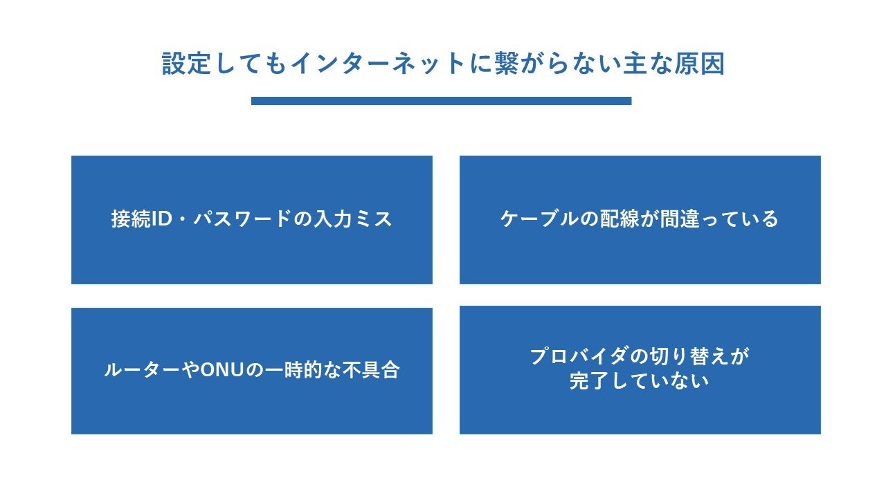 手順通りに設定したはずなのに、なぜかインターネットに繋がらない。そんな時に考えられる主な原因と、ご自身で試せる対処法をご紹介します。落ち着いて一つずつ確認していきましょう。