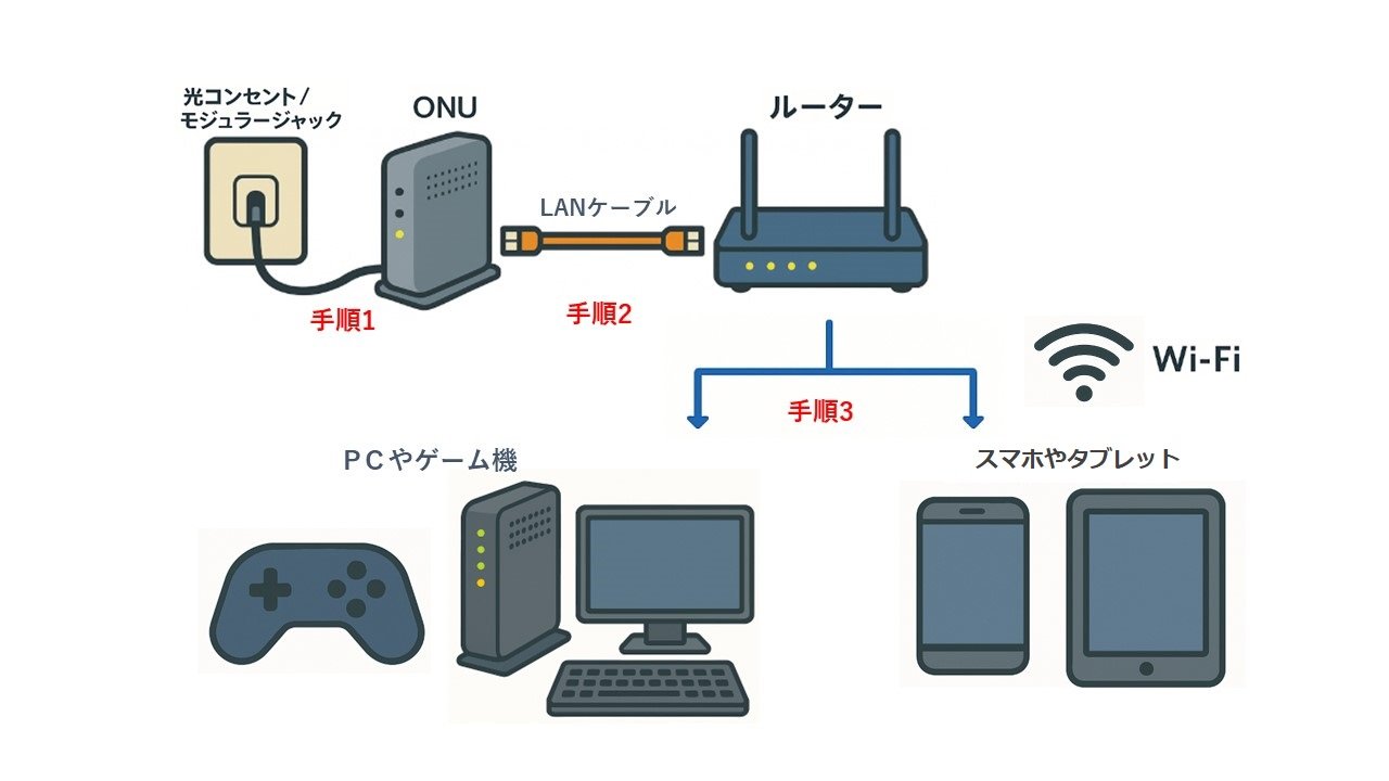 最後に、ルーターからパソコンやゲーム機などの各端末へ接続します。