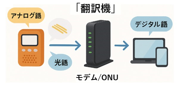 しかし、私たちのパソコンやスマートフォンは「デジタル語」しか理解できません。そこで、モデムやONUという「翻訳機」が、それぞれの回線の言語をデジタル語へと通訳し、私たちに意味が分かるようにしてくれるのです。