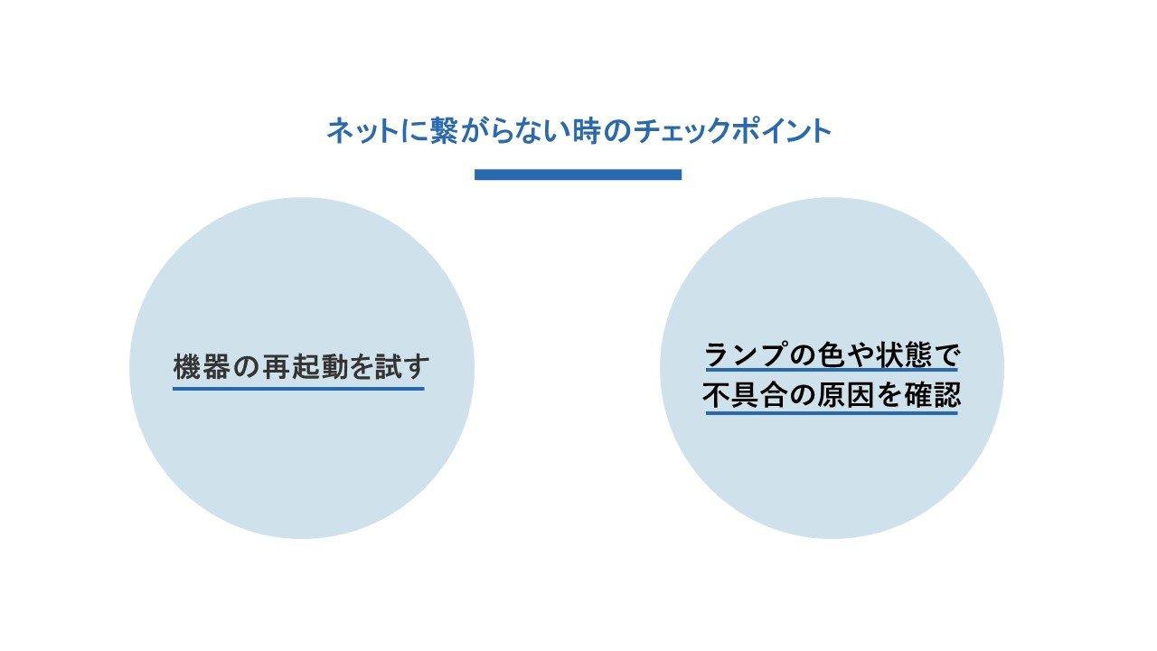 パソコンやスマートフォンと同じように、通信機器も長時間稼働していると、内部で一時的なエラーが発生することがあります。再起動することで、そのエラーが解消され、あっさりと問題が解決するケースは非常に多いです。サポートセンターに連絡する前に、まずはこれを試してみましょう。