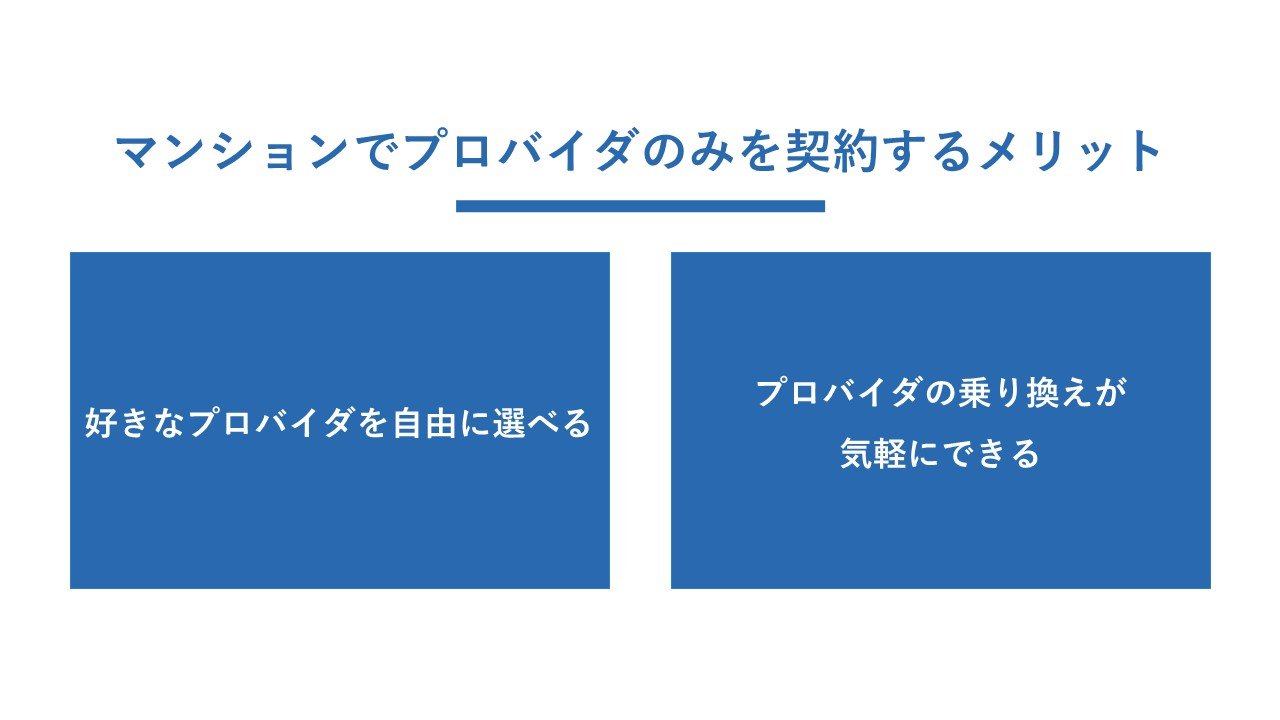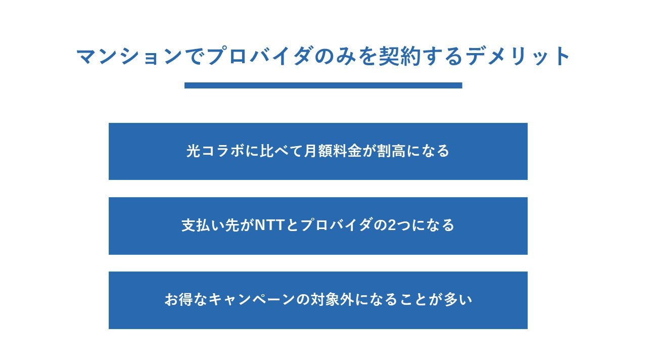 これは、NTT東日本・西日本と『フレッツ光』の回線契約を行い、それとは別に、インターネット接続サービスを提供するプロバイダとも契約する方法です。つまり、契約先と月々の支払いがNTTとプロバイダの2か所になります。今回あなたが検討している「プロバイダのみ契約」は、すでにマンションにフレッツ光の回線が引かれているため、追加でプロバイダと契約することを指します。