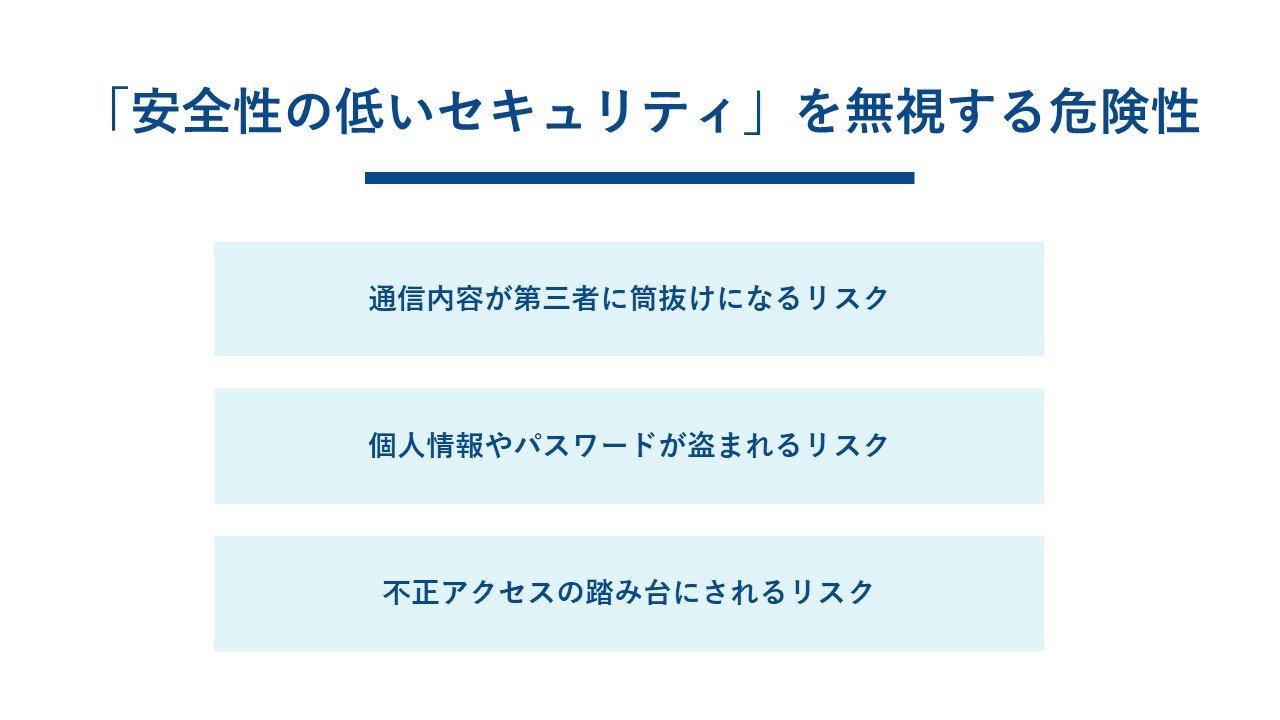 カフェや駅などで提供されているフリーWi-Fiは、利便性を優先するためにパスワードが設定されていなかったり、古いセキュリティ規格が使われていたりすることが少なくありません。このような安全性の低いフリーWi-Fiでは、個人情報やクレジットカード情報の入力、重要なデータのやり取りは絶対に避けるべきです。どうしても利用する場合は、VPN(仮想プライベートネットワーク)を利用するなど、自衛策を講じましょう。