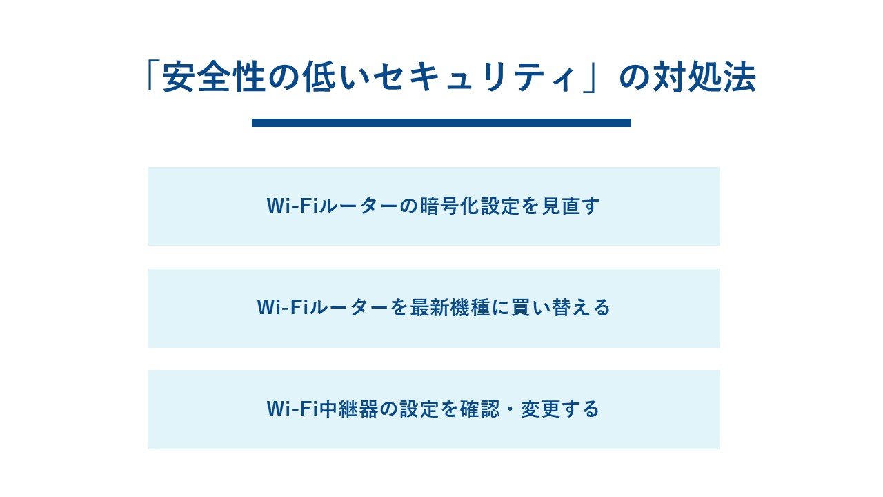 最も効果的な解決策は、Wi-Fiルーターの暗号化設定を最新の「WPA3」または「WPA2(AES)」に変更することです。設定変更が難しい場合や、ルーターが古すぎて対応していない場合は、新しい機種への買い替えを検討しましょう。
