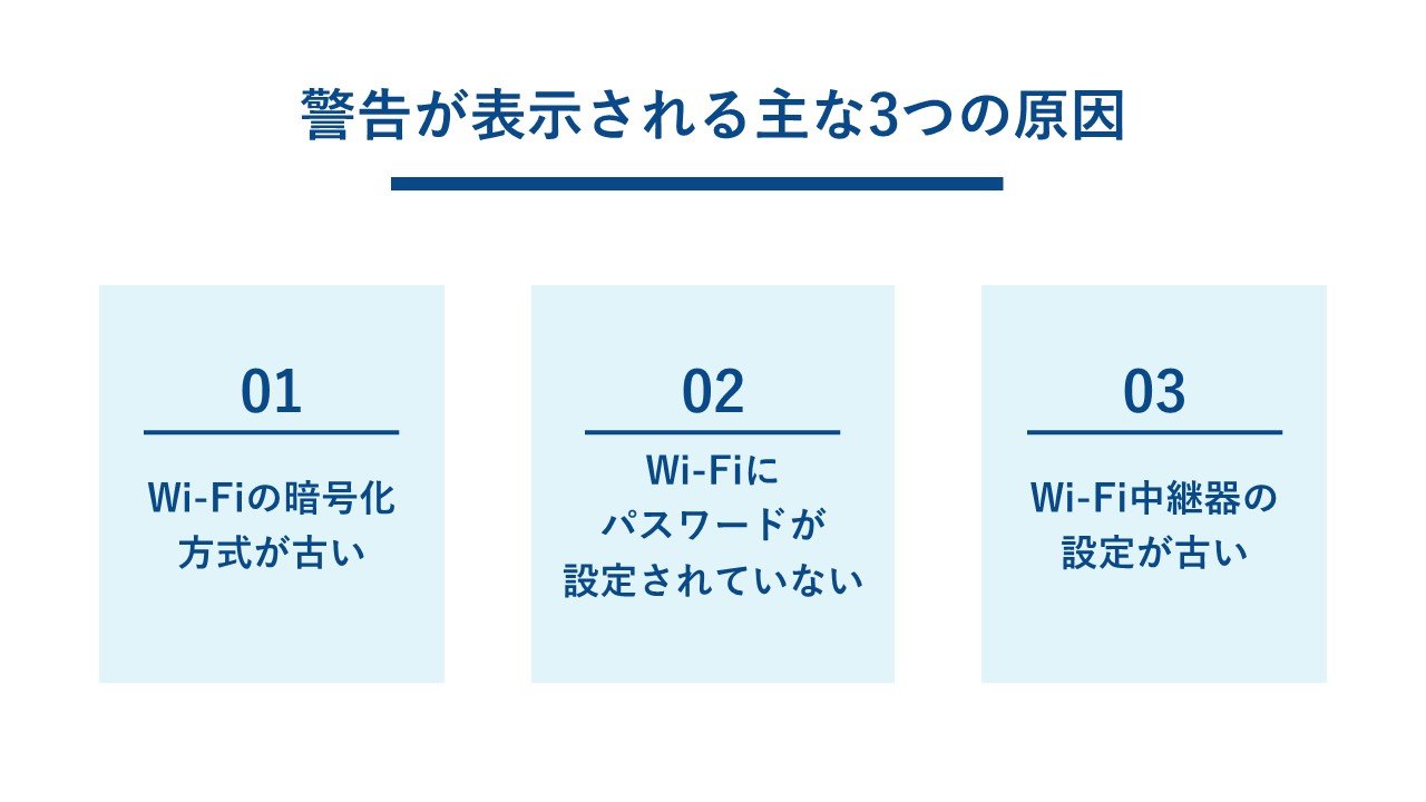 Wi-Fiに接続するためのパスワード(暗号化キー)が設定されていない、いわゆる「野良Wi-Fi」の状態でも警告が表示されます。パスワードがなければ誰でもあなたのネットワークに接続できてしまい、通信内容の盗聴や、あなたの回線を使った犯罪予告などに悪用されるリスクがあり、非常に危険です。