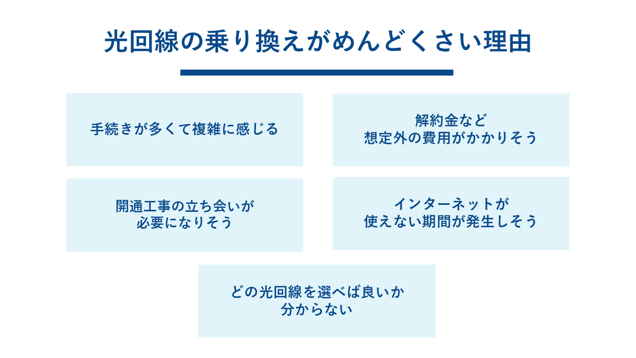 多くの方が光回線の乗り換えを「めんどくさい」と感じるのには、いくつかの共通した理由があります。まずは、その理由を一つひとつ確認し、漠然とした不安を解消していきましょう。ご自身の不安がどこにあるのかを把握することが、スムーズな乗り換えへの第一歩です。