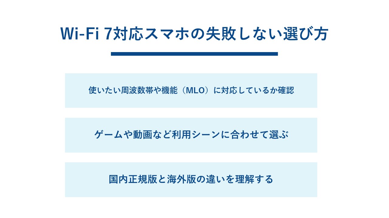 待望のWi-Fi 7対応スマートフォンを手に入れても、選び方を間違えると性能を十分に発揮できない可能性があります。ここでは、購入前に確認すべき3つのポイントを解説します。