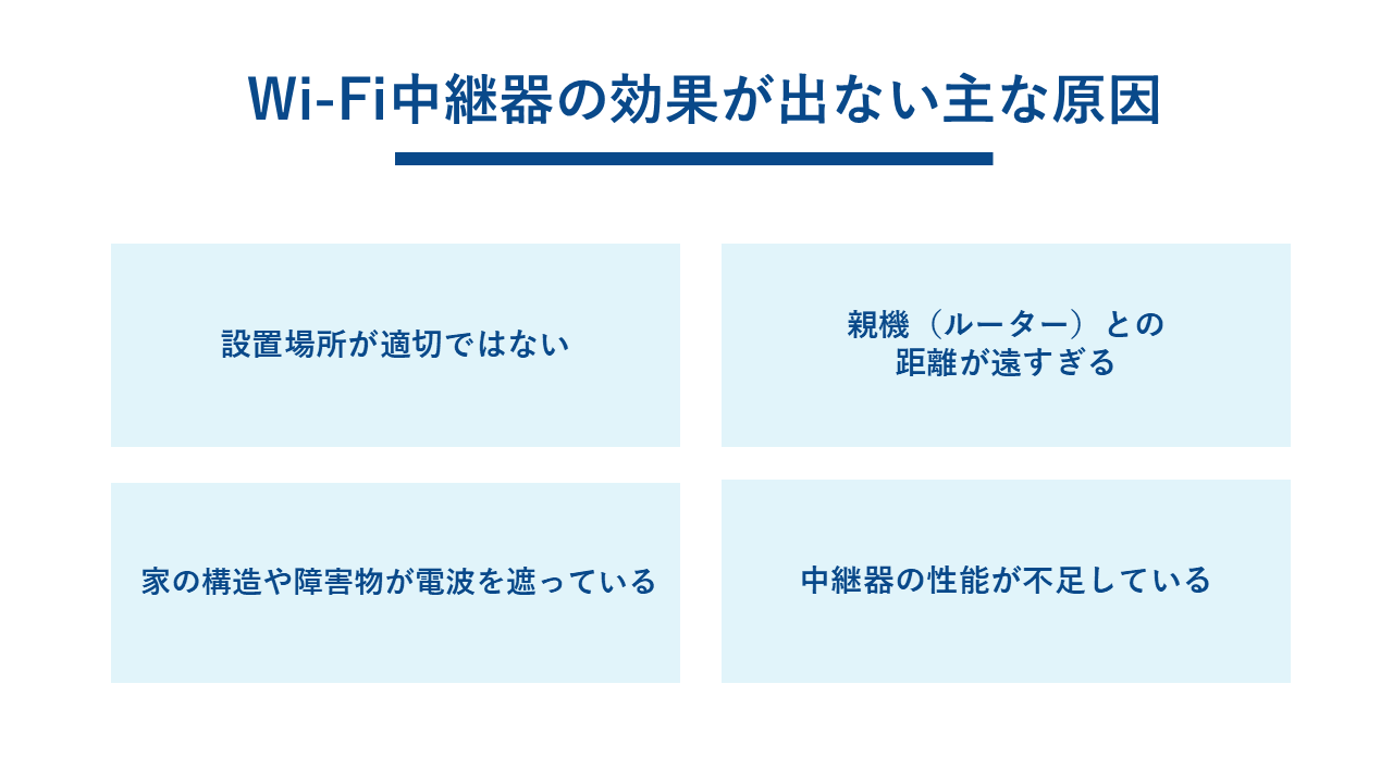 「中継器を置いたのに、状況が全く改善されない」という場合、いくつかの原因が考えられます。多くの場合、機器の故障ではなく、設置環境や製品のスペックに問題があります。ここでは、効果が出ない代表的な原因を見ていきましょう。