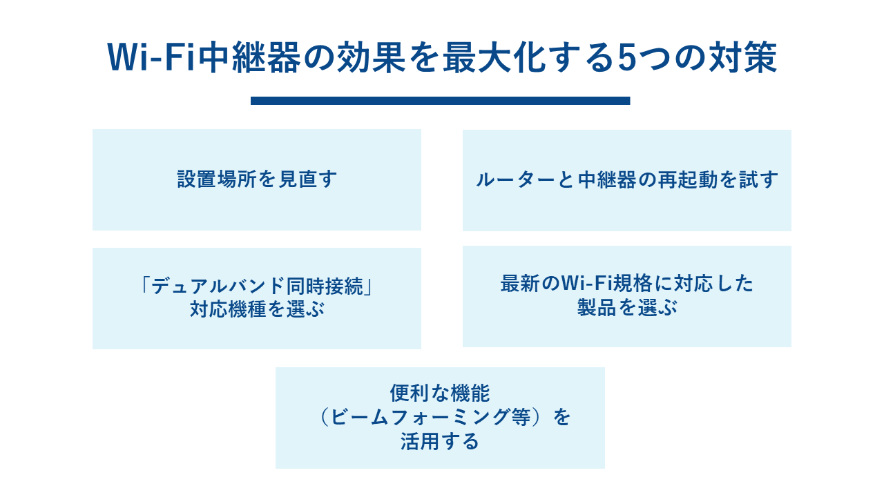 Wi-Fi中継器の効果がないと感じる原因がわかったところで、次はその効果を最大限に引き出すための具体的な対策をご紹介します。簡単な見直しで、通信環境が大幅に改善されることもありますので、ぜひ試してみてください。
