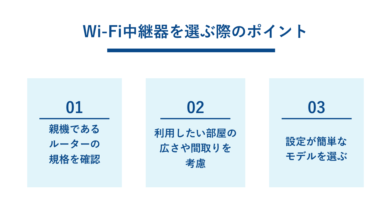 これからWi-Fi中継器の購入を検討される方や、買い替えを考えている方が失敗しないために、選ぶ際の重要なポイントを3つご紹介します。