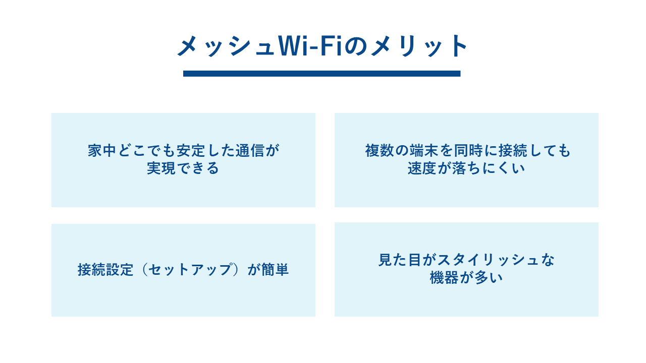 メッシュWi-Fiには、従来のWi-Fi環境の悩みを解決する多くのメリットがあります。ここでは主な4つのメリットを紹介します。