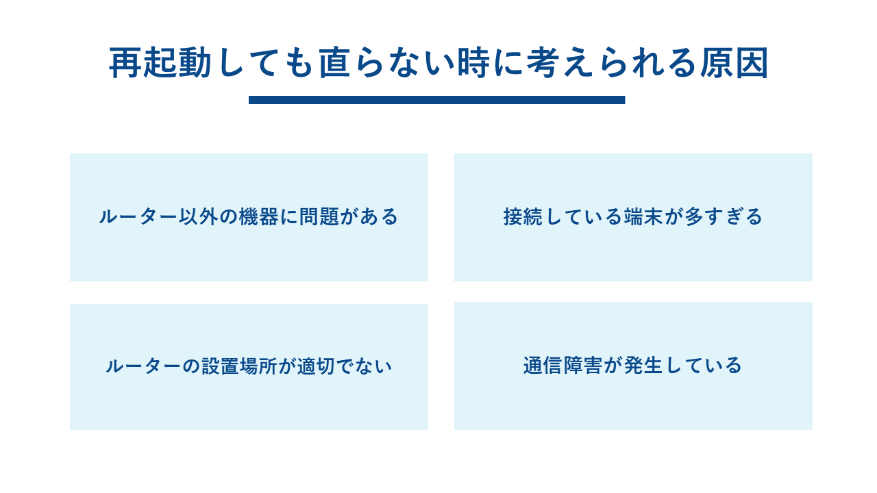 ルーターの再起動は万能ではありません。再起動を試してもインターネット接続が改善しない場合、他に原因がある可能性が考えられます。