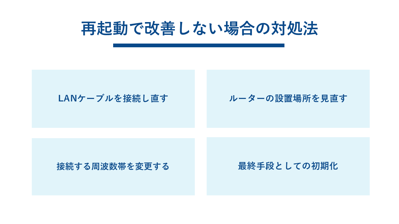 ルーターの再起動を試み、他の原因も考えられない場合、以下の対処法を試すことで状況が改善する可能性があります。