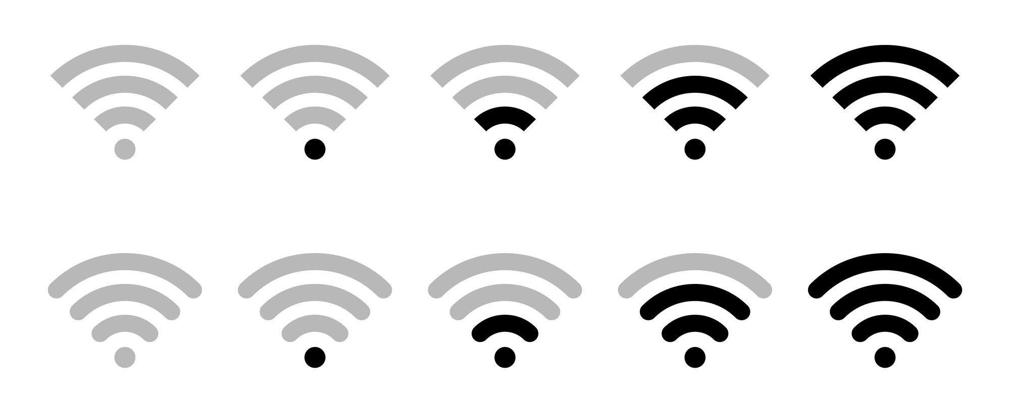 扇形のマークは、中心の点から広がる複数の曲線で構成されています。この曲線の数(塗りつぶされている部分の量)は、Wi-Fiの「電波の強さ」を表しています。