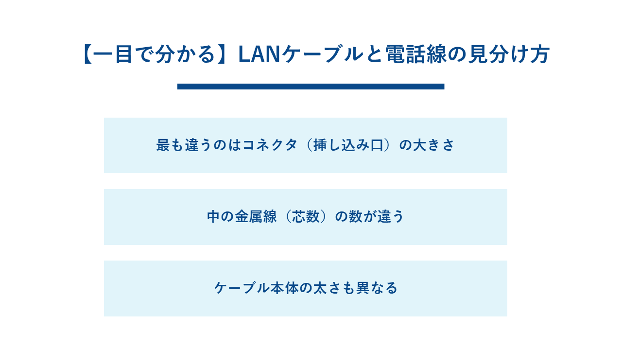 2つのケーブルを見分ける最も確実な方法は、先端にあるコネクタの大きさを見ることです。LANケーブルのコネクタは「RJ-45」という規格で、電話線の「RJ-11」という規格よりも一回り大きくなっています。 明らかに大きさが違うため、並べてみるとすぐに見分けがつきます。