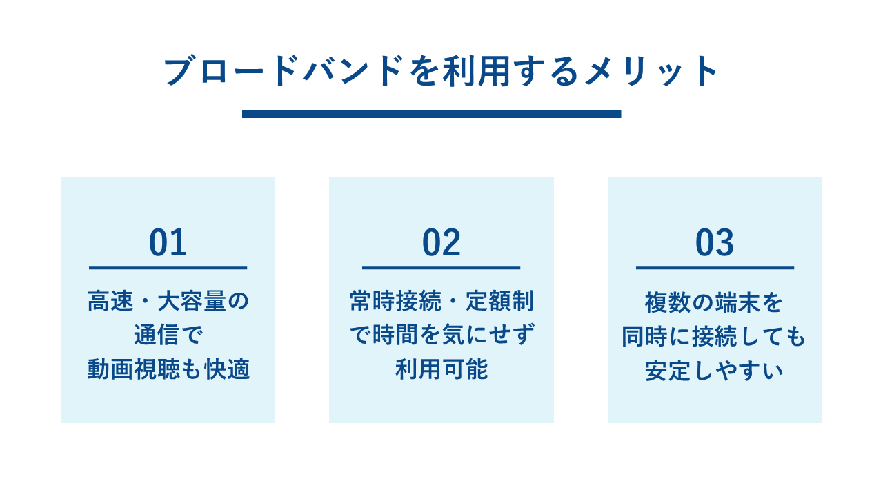 ブロードバンドが普及したことで、私たちのインターネット体験は大きく向上しました。ここでは、ブロードバンドを利用することの具体的なメリットを3つ紹介します。