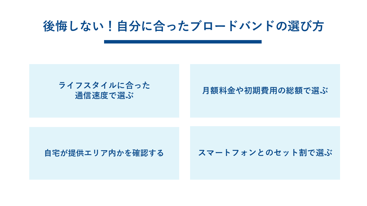 数多くのブロードバンドサービスの中から、自分にとって最適なものを選ぶにはどうすればよいのでしょうか。ここでは、後悔しないための選び方のポイントを4つ紹介します。
