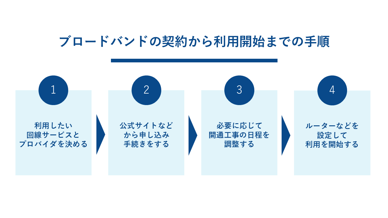 実際にブロードバンドを利用するためには、いくつかの手順を踏む必要があります。ここでは、申し込みから利用開始までの一般的な流れを解説します。