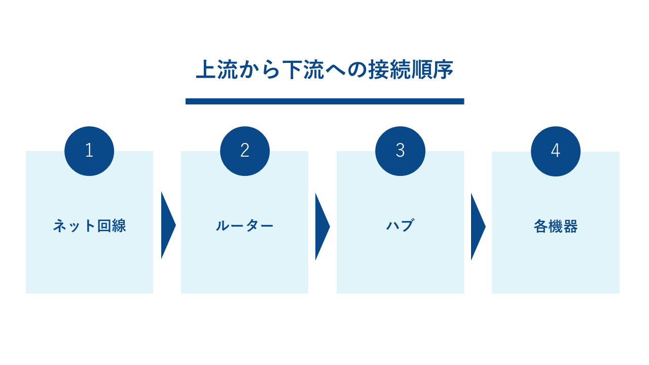 このように、大元の回線→ルーター→ハブ→各機器という順番を守ることで、ルーターが正しく司令塔の役割を果たしてくれます。