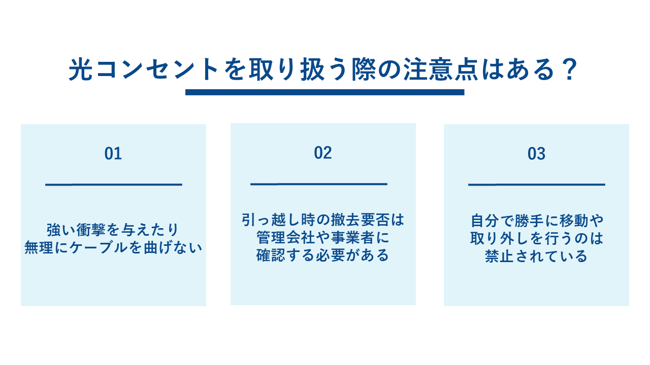 光コンセントやそこから伸びる光ファイバーケーブルは、非常に繊細な機器です。間違った扱い方をすると、断線してネットが繋がらなくなったり、修理費用が発生したりすることがあります。
