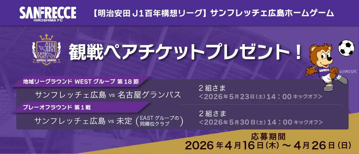 応募期間中にご応募いただいたお客さまの中から、【明治安田J1百年構想リーグ】サンフレッチェ広島ホームゲーム観戦ペアチケットを、抽選でプレゼントいたします。