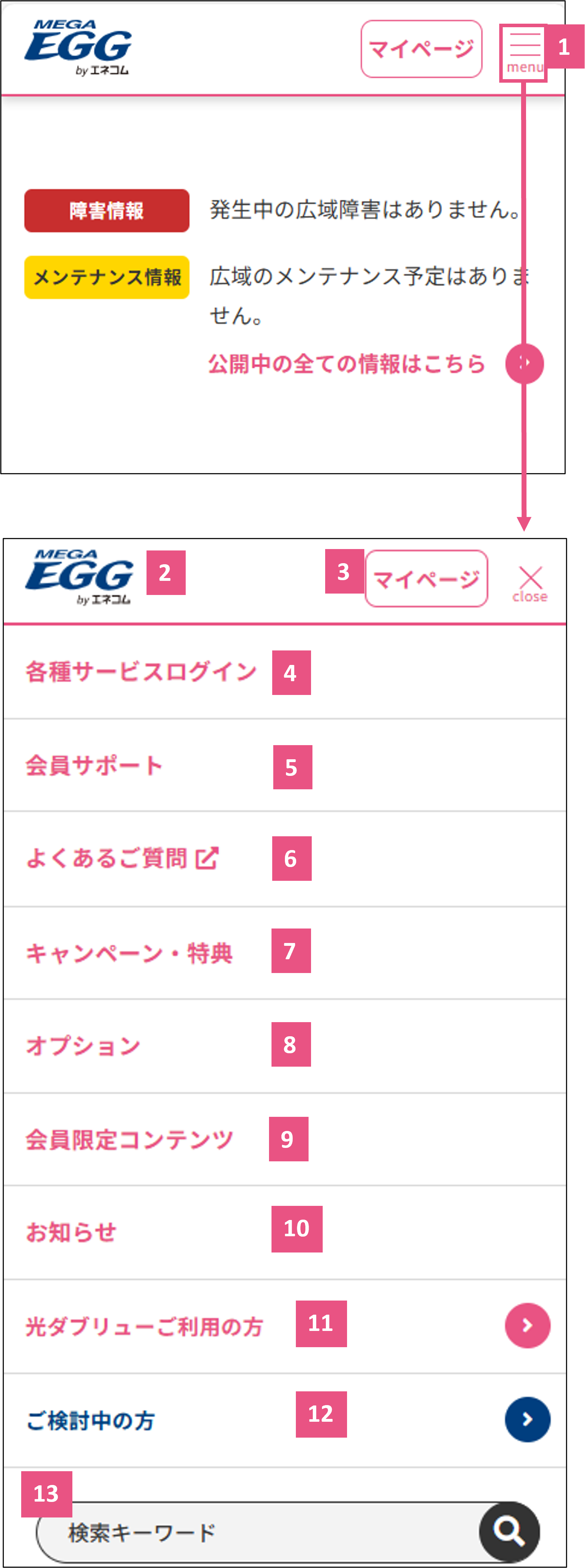 メガ・エッグの会員サイトのメニューは、以下のような構成となっています。